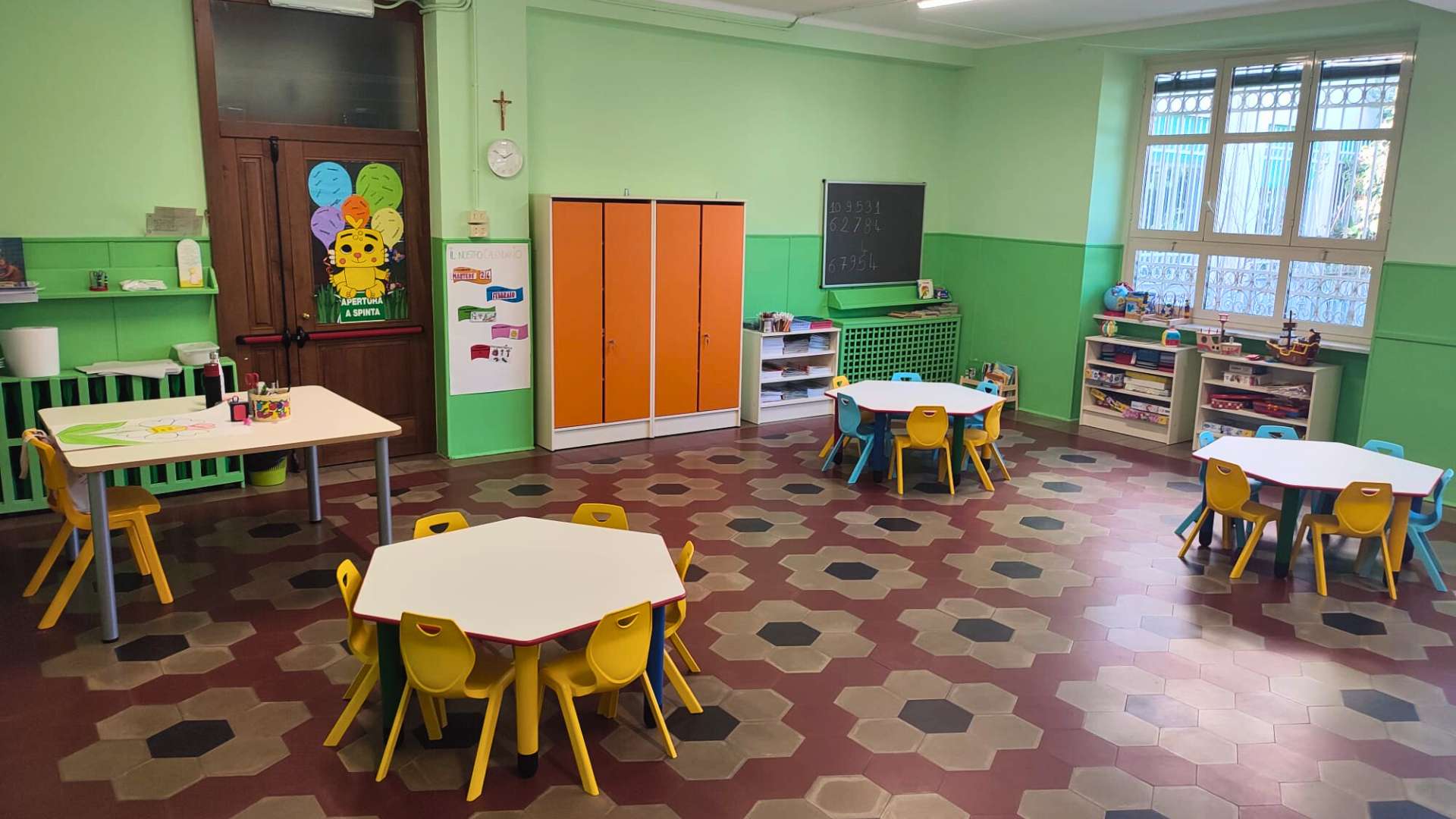 La rimodulazione degli arredi delle aule rappresenta un ulteriore passo verso una scuola più inclusiva. I nuovi banchi esagonali e le scrivanie modulari favoriscono il lavoro in piccoli gruppi, la collaborazione e la condivisione. La loro configurazione permette inoltre di accogliere senza difficoltà i bambini che utilizzano la sedia a rotelle, garantendo autonomia e partecipazione attiva alla vita della classe.