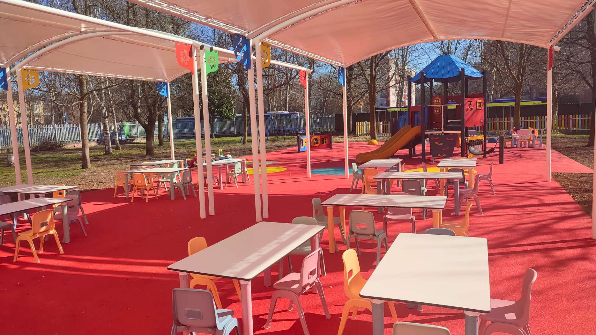 Nei mesi primaverili ed estivi, la scuola potrà contare su un gazebo esterno attrezzato con tavoli e sedie accessibili anche ai bambini diversamente abili. Questo spazio permetterà di spostare la didattica all’aria aperta, offrendo ai piccoli la possibilità di apprendere routine e attività scolastiche in un ambiente naturale, più disteso e stimolante.