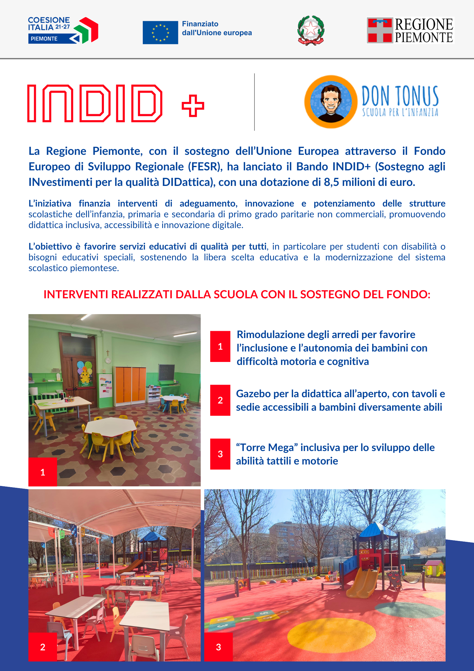 Il percorso avviato con il bando INDID+, lanciato da Regione Piemonte con il sostegno dell’Unione Europea attraverso il Fondo Europeo di Sviluppo Regionale (FESR), sta portando alla realizzazione di ambienti sempre più accoglienti, accessibili e pensati per rispondere ai bisogni di tutti i bambini. Gli interventi programmati mirano a favorire autonomia, partecipazione e benessere, valorizzando la dimensione educativa attraverso spazi che facilitano l’apprendimento e la relazione.